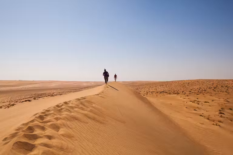 Pocas experiencias marcan tanto como entrar en el desierto. Las dunas de Wahiba Sands se extienden durante kilómetros, con tonos que cambian del dorado al rojizo según avanza el sol. Allí nos esperan las familias beduinas, mujeres que mantienen tradiciones ancestrales en un entorno cada vez más transformado por la modernidad.