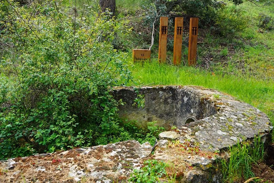 Avanzamos por la pista dejando atrás el embalse hasta llegar a un panel que ilustra el itinerario del acueducto de Segovia en su totalidad. A partir de ahí el camino se convierte en senda, asciende paulatinamente y el paisaje se vuelve más boscoso. Tras atravesar un arroyo, por un rudimentario puente de madera, hallaréis la señal indicativa hacia la captación de aguas, la que debéis seguir, y otra hacia el arroyo Valdeconejos que tomaremos más tarde. En este punto comenzaremos a ver los primeros pozos de registro que también serán constantes a lo largo del trayecto. Un breve y placentero paseo nos conduce hasta el azud, el lugar donde recoge las aguas del río Frío, a unos 1.255 metros de altitud.